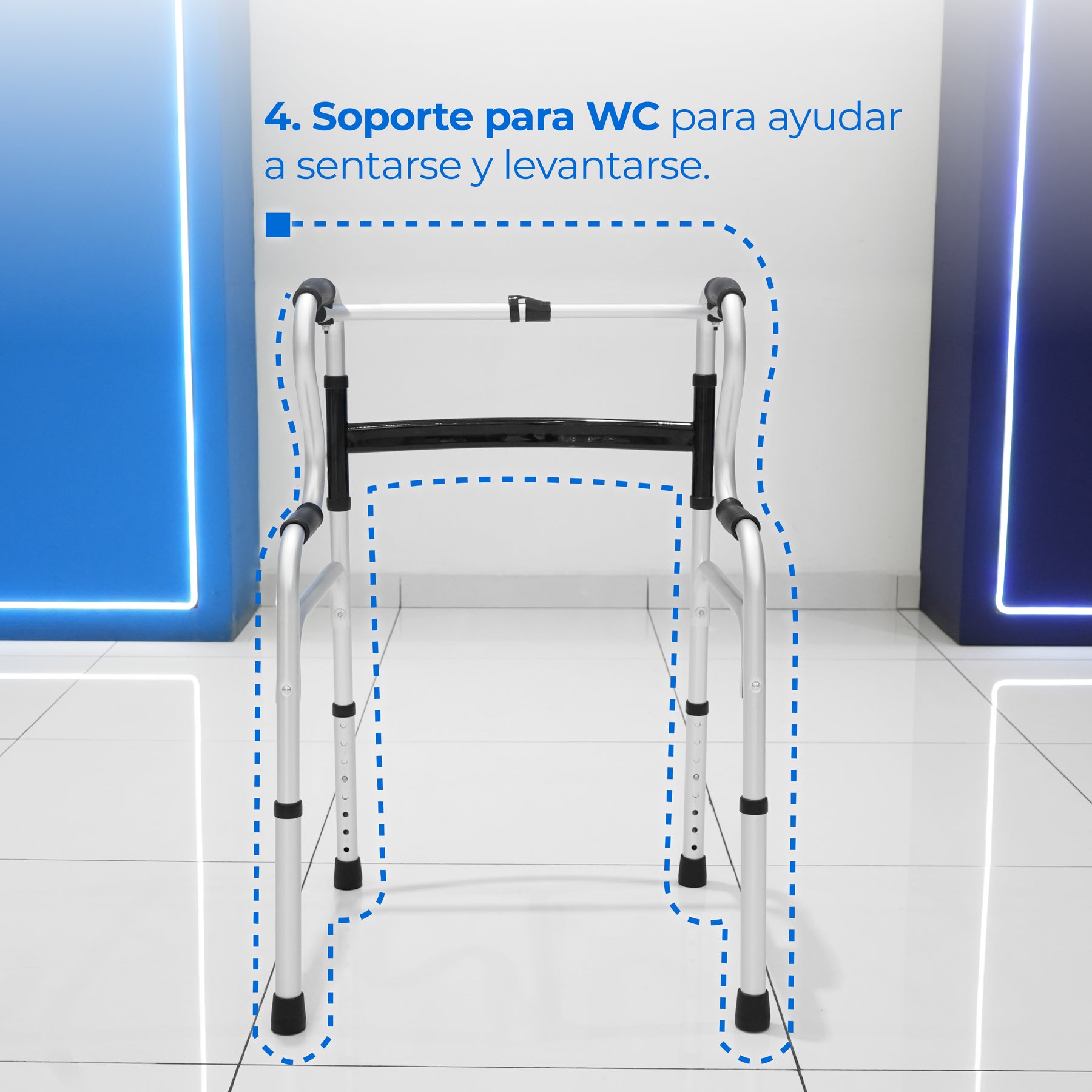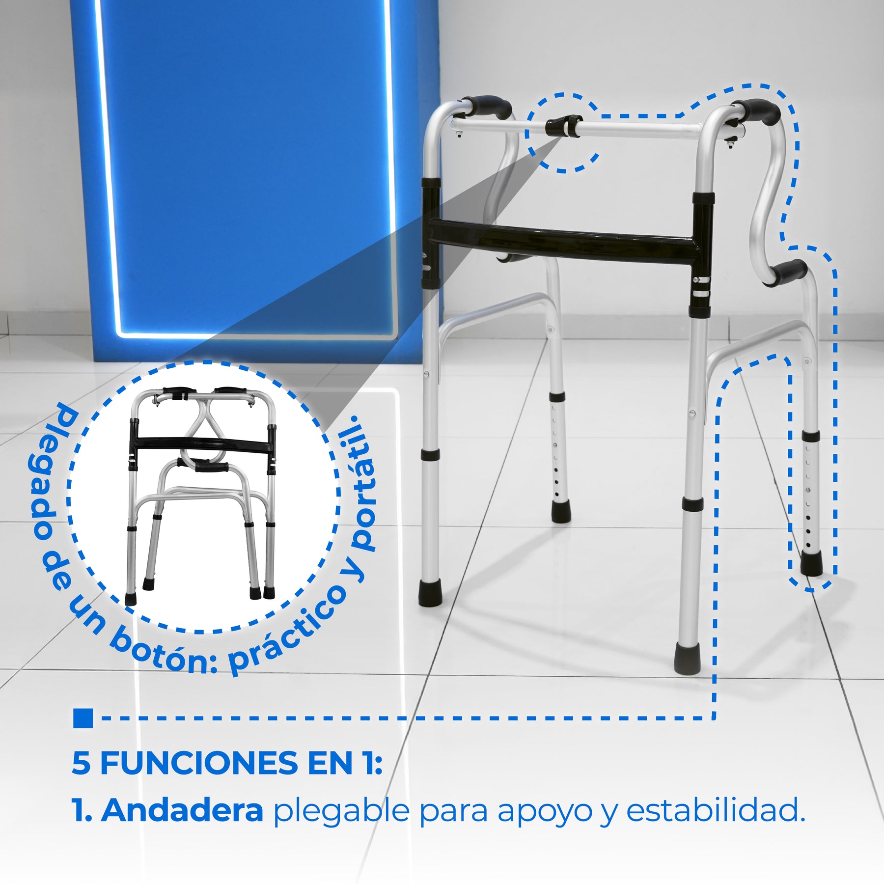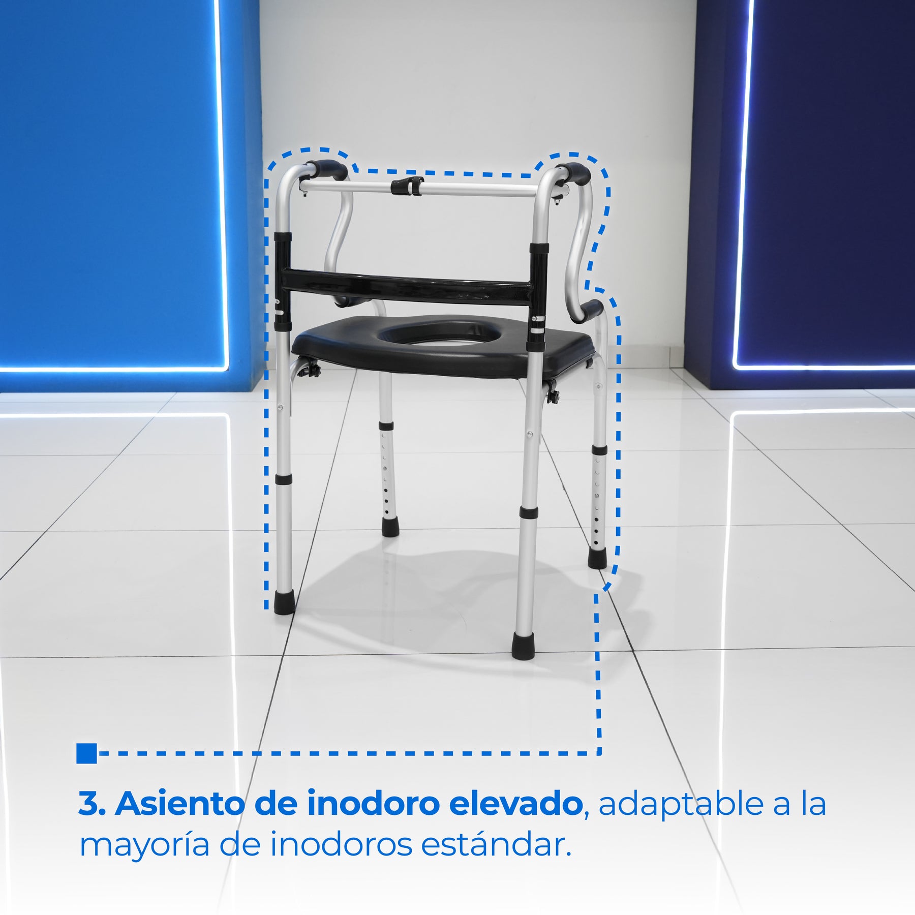 Nuestra Andadera plegable con 5 funciones, con cómodo de 5 litros, asiento de inodoro elevado, ajustable en altura y modo silla para baño – Marca Handy (SKU: AN15GDP) es una andadera multifuncional diseñada para combinar movilidad, confort y apoyo en actividades cotidianas, ideal para personas con movilidad reducida que buscan un solo equipo con múltiples funciones integradas.