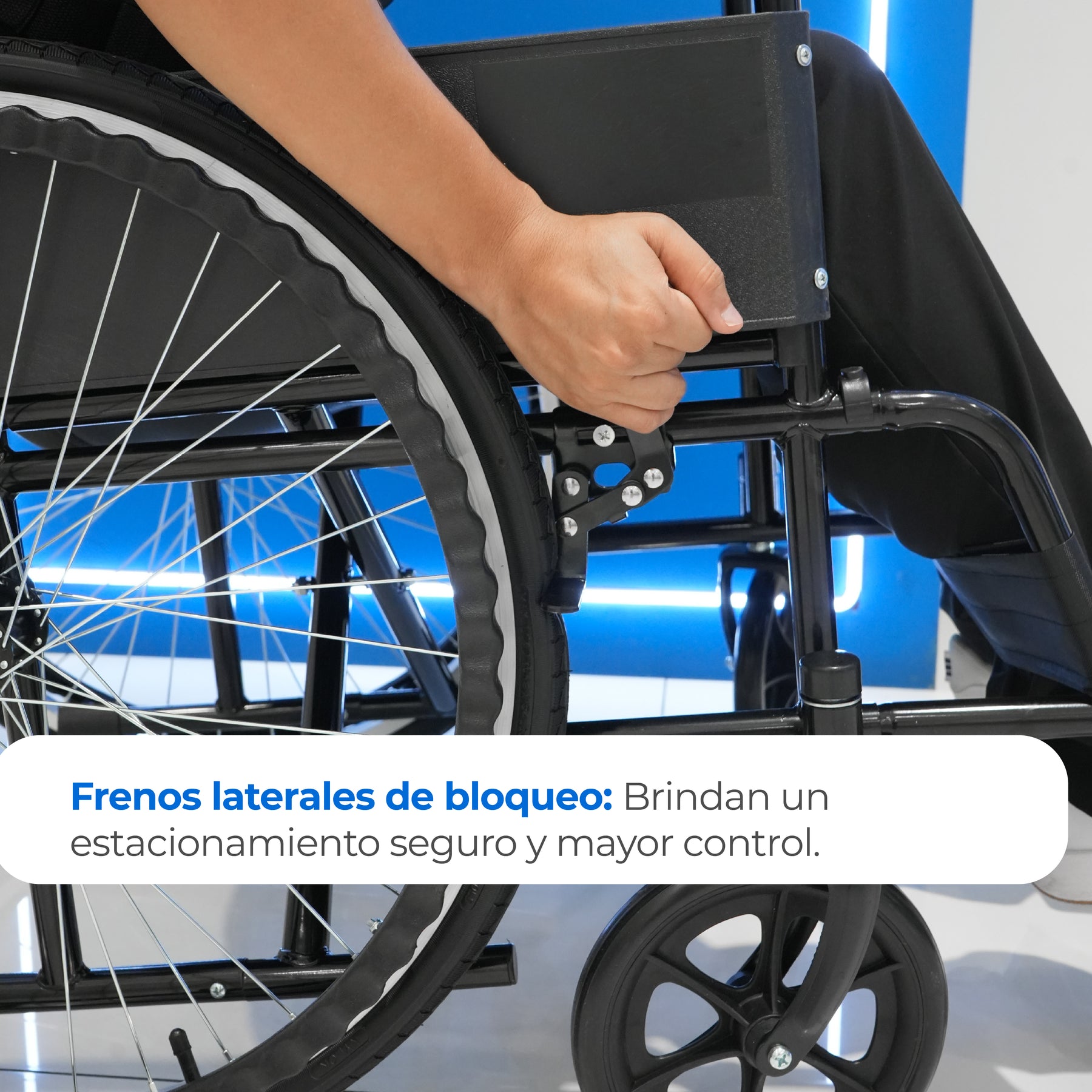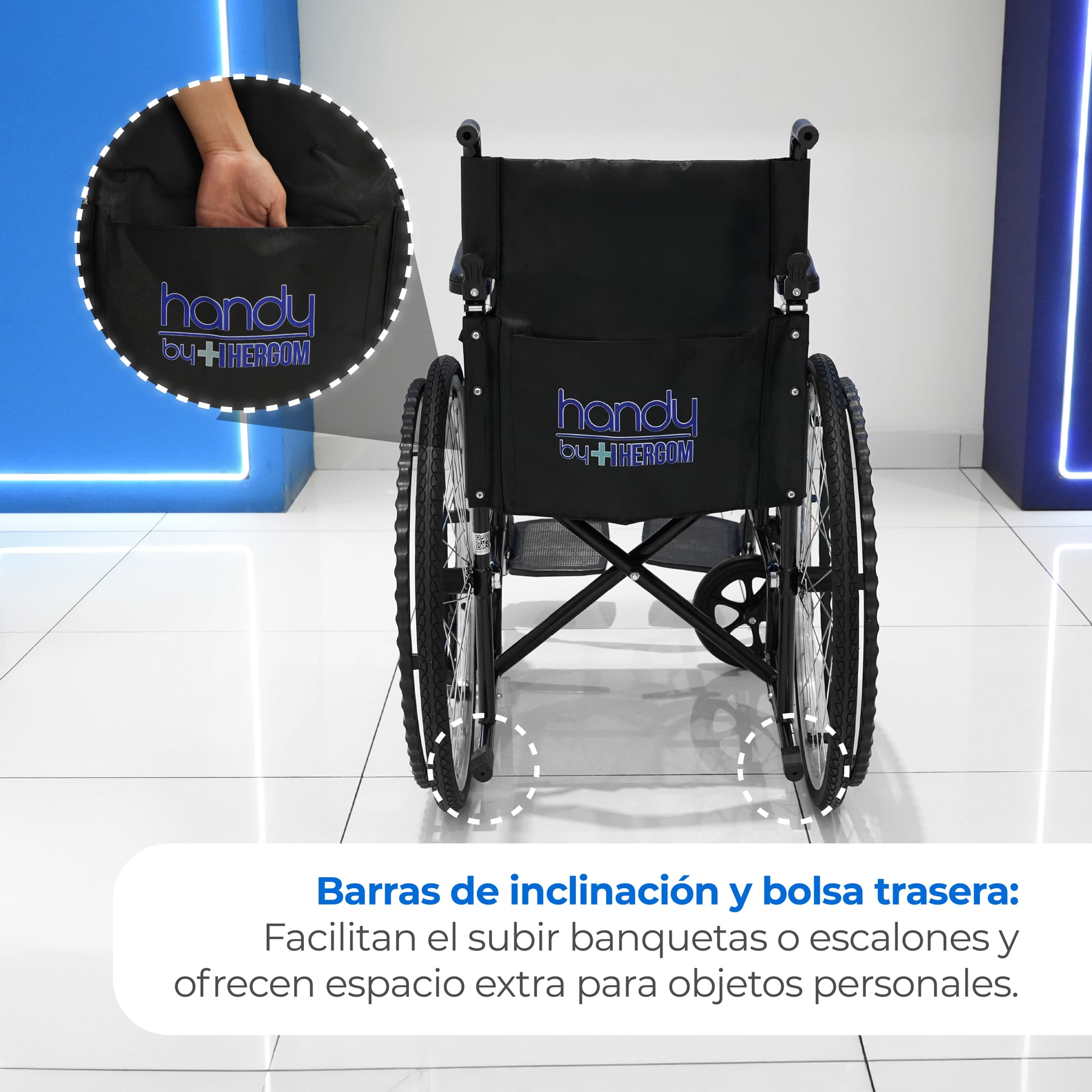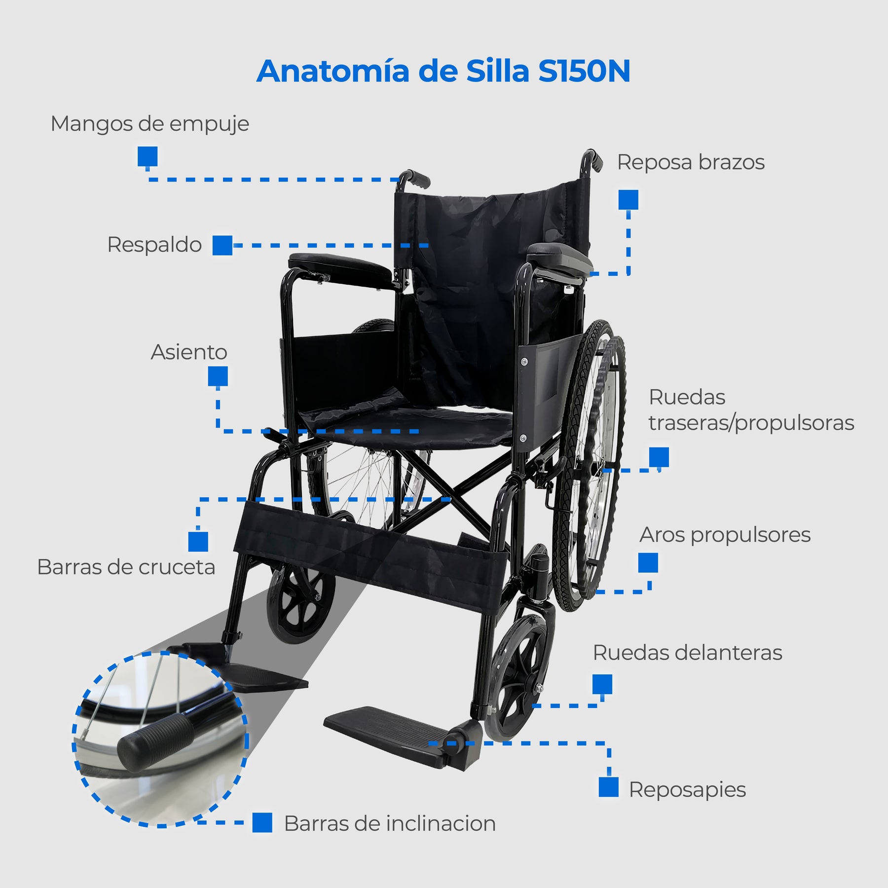 Silla de ruedas neumática básica Handy S150N con estructura de acero, freno de seguridad y ruedas de aire para desplazamientos cómodos y seguros.