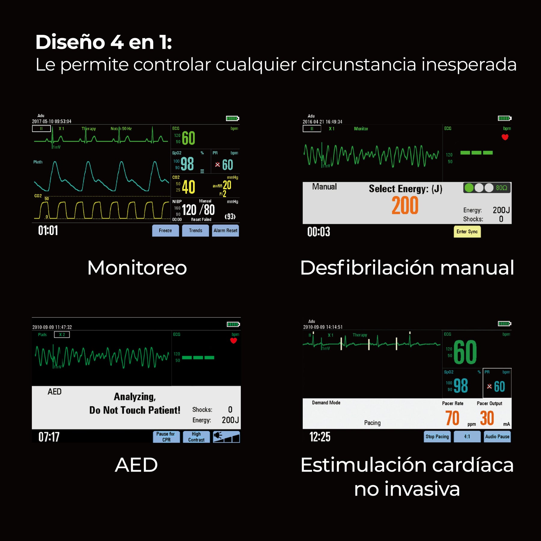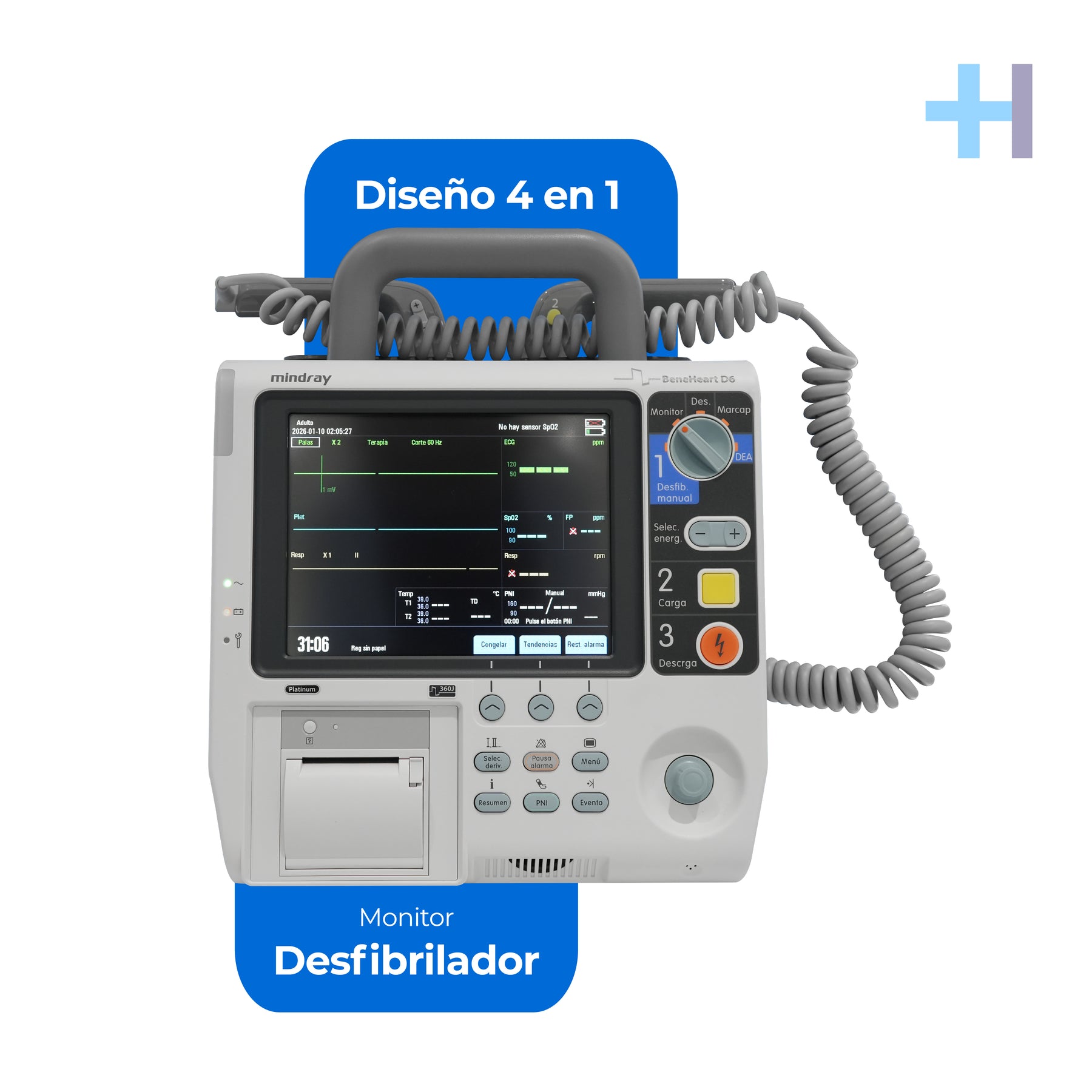 - Diseño compacto 4 en 1 que integra: monitorización, desfibrilación manual, DEA y marcapasos.