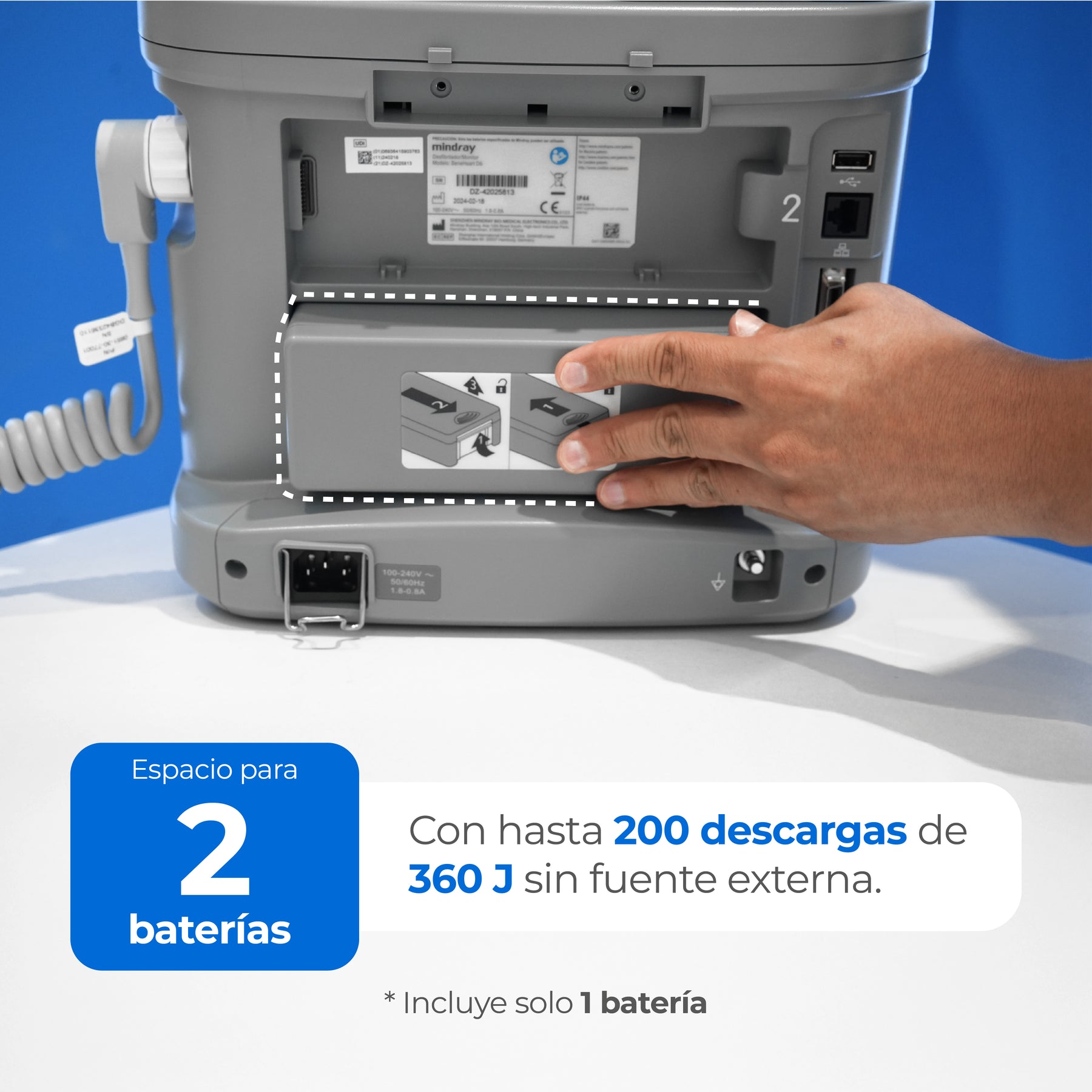 - Gran capacidad de alimentación con hasta 2 baterías que permite la monitorización continua y de larga duración y descargas durante el transporte sin una fuente de alimentación externa (incluye 1 batería en la compra).