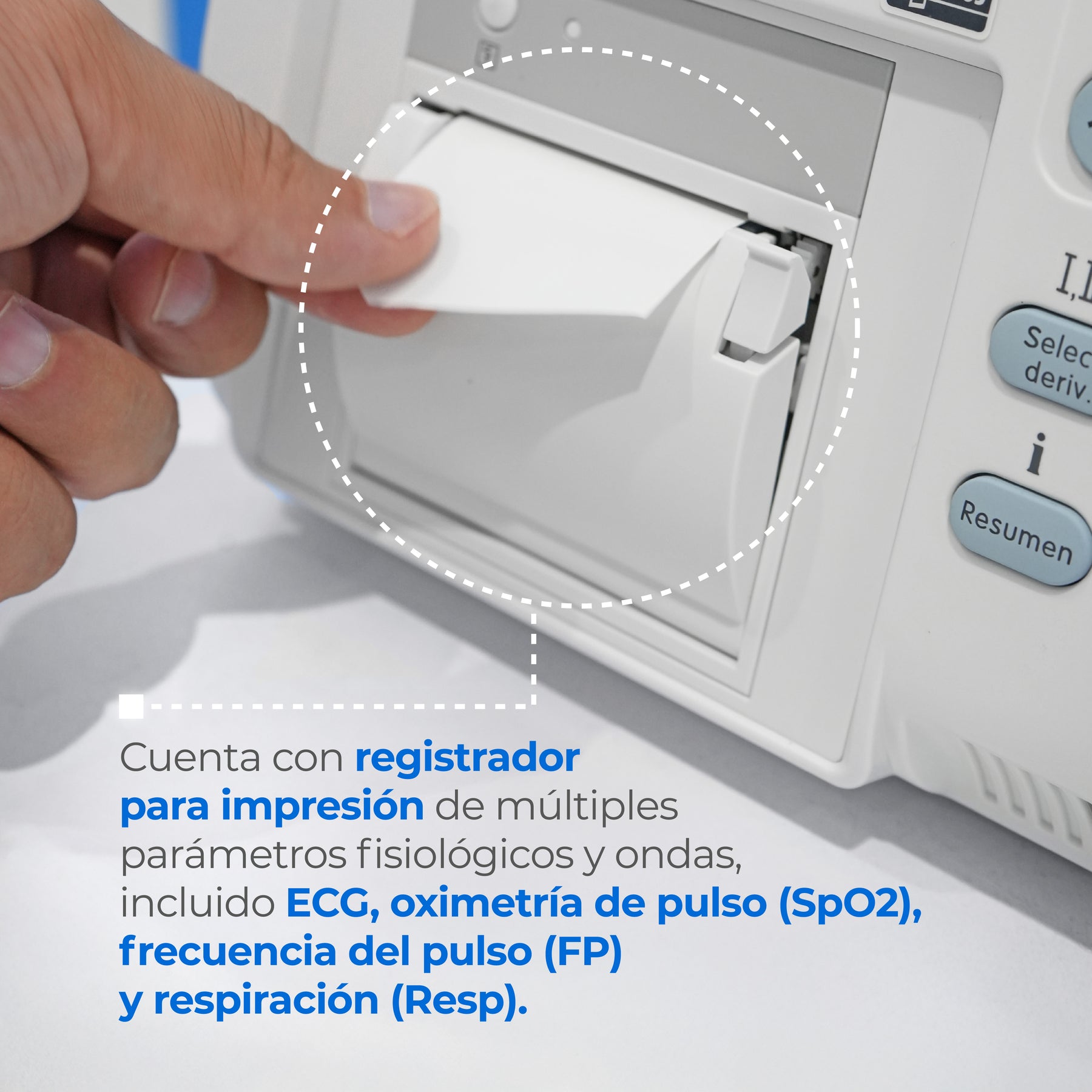 (ECG) electrocardiograma, pulsioximetria (SpO2), temperatura (Temp), presión sanguínea no invasiva (PNI) y dióxido de carbono (CO2).