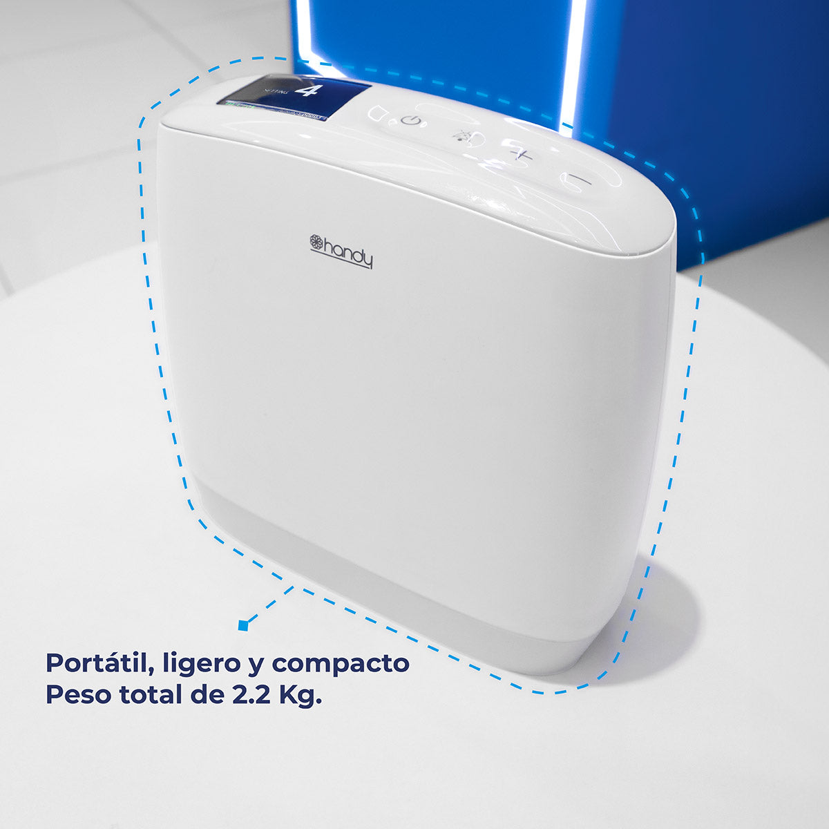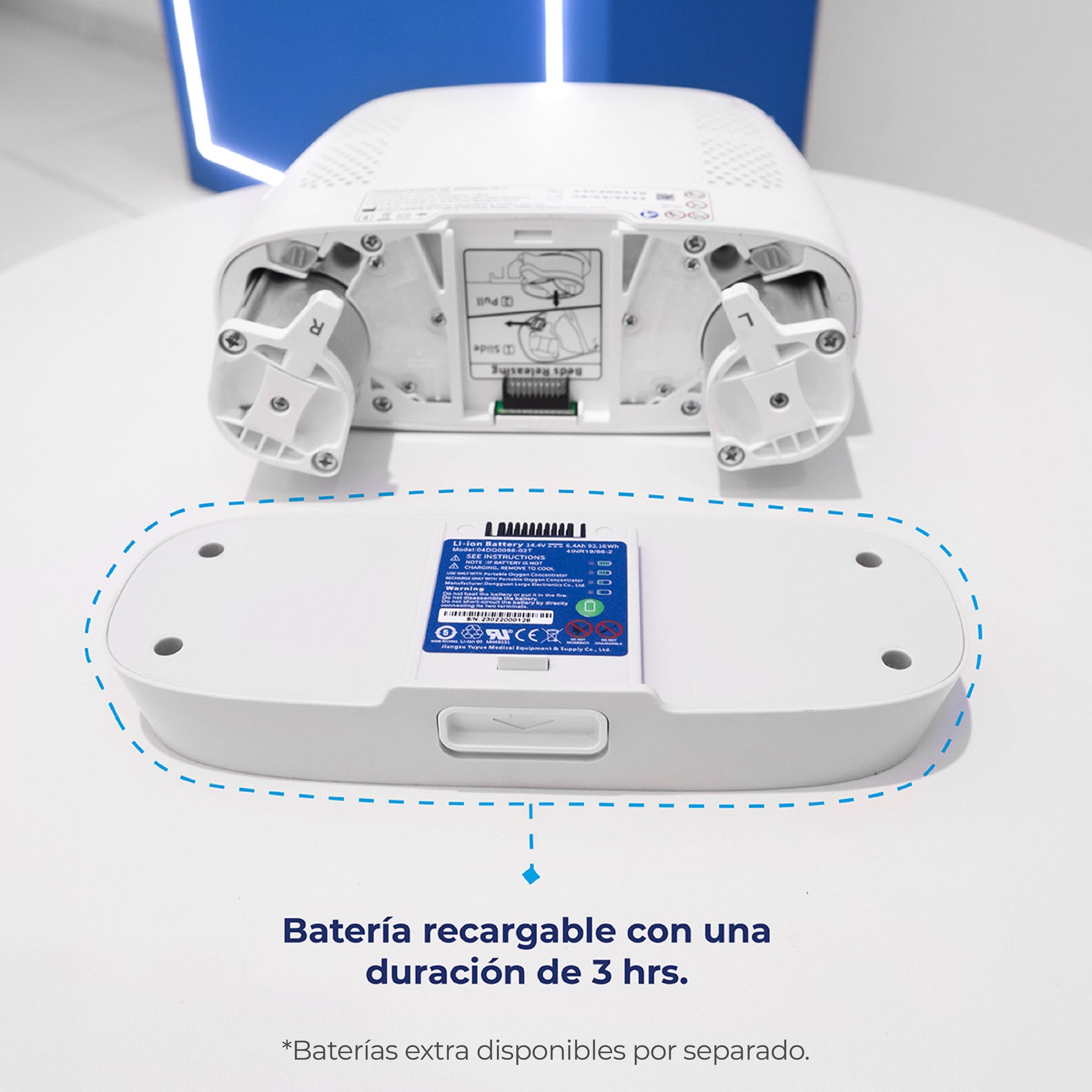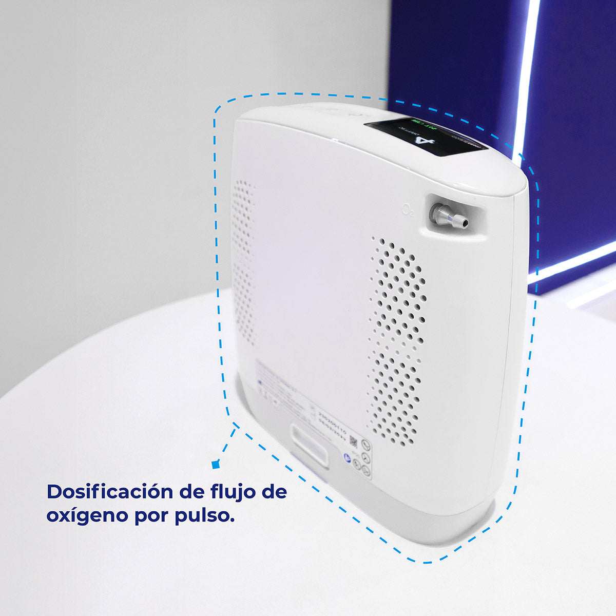 Flujo de Oxígeno de Hasta 3.5 L x Min, Llévalo Contigo a Todas Partes. Regulación de 4 Niveles de flujo de Oxígeno, Sistema de Alerta Automático en Caso de Interrupción de Flujo de Oxígeno.