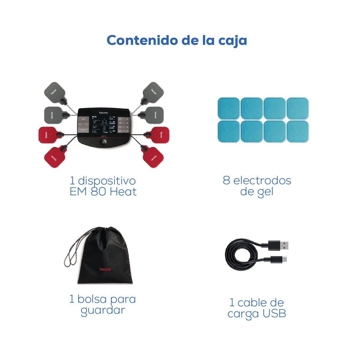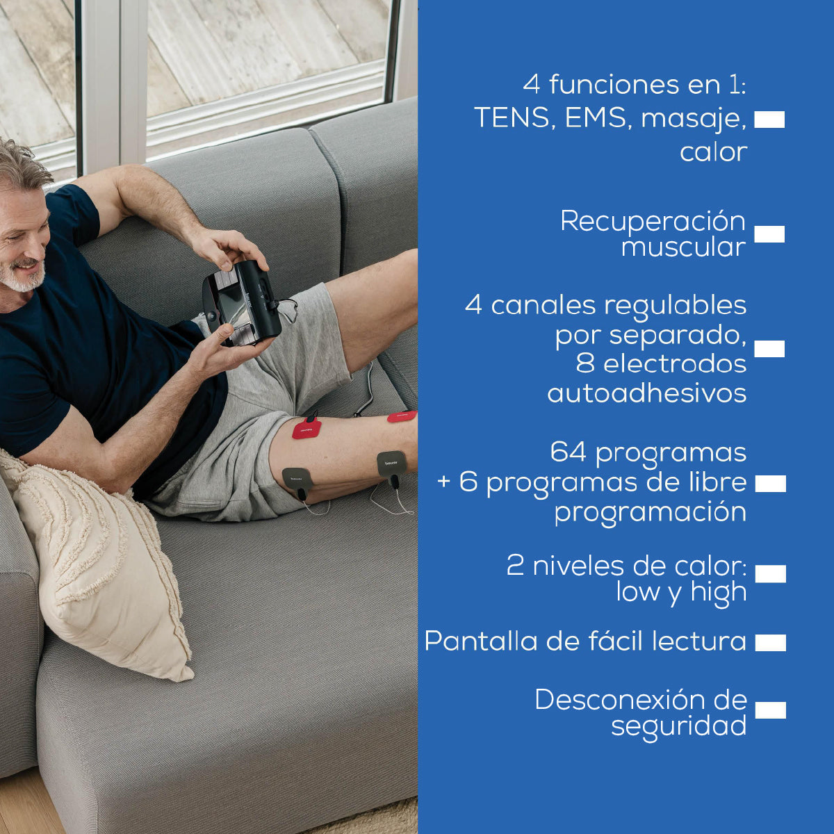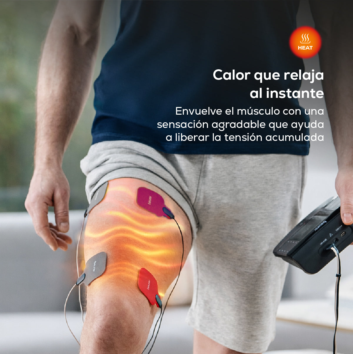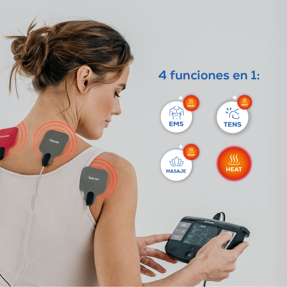 Electroestimulador muscular con función de calor, 3 en 1 (EMS, TENS y masaje) con electrodos de gel y cables incluídos